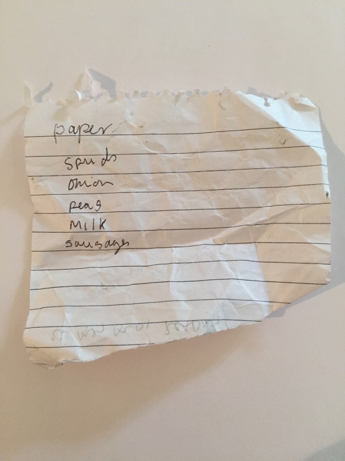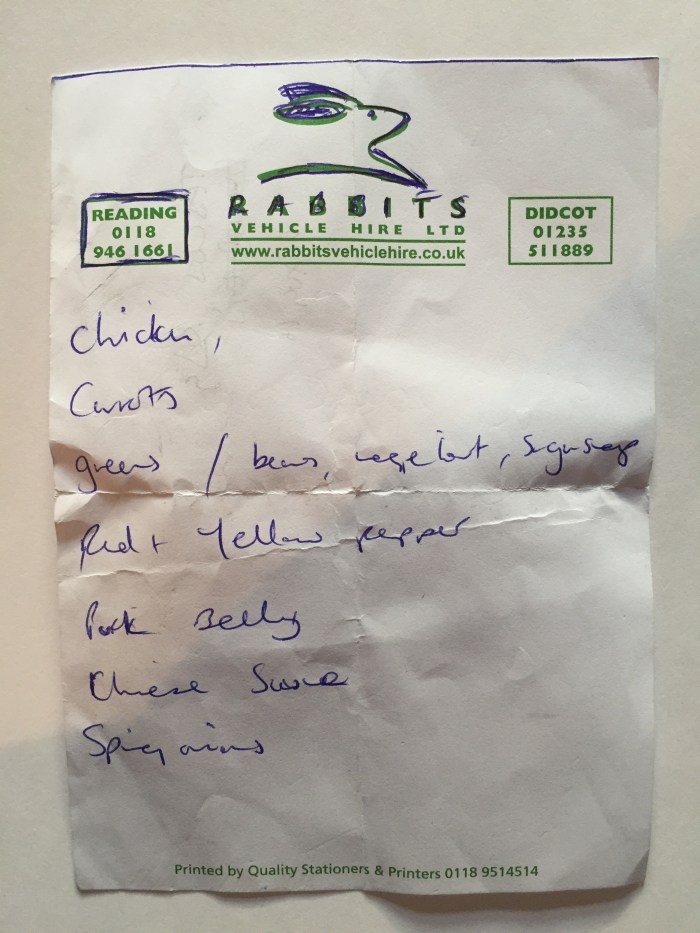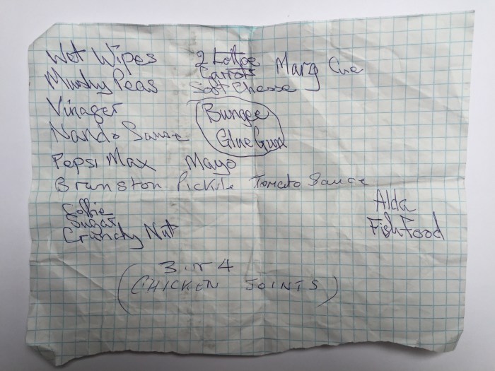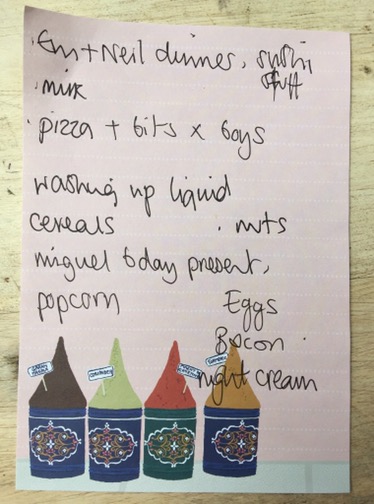 Em and Neil Dinner, sushi stuff, milk, pizza and bits for boys, washing up liquid, cereals, nuts, Miguel birthday present, popcorn, eggs, bacon, night cream.