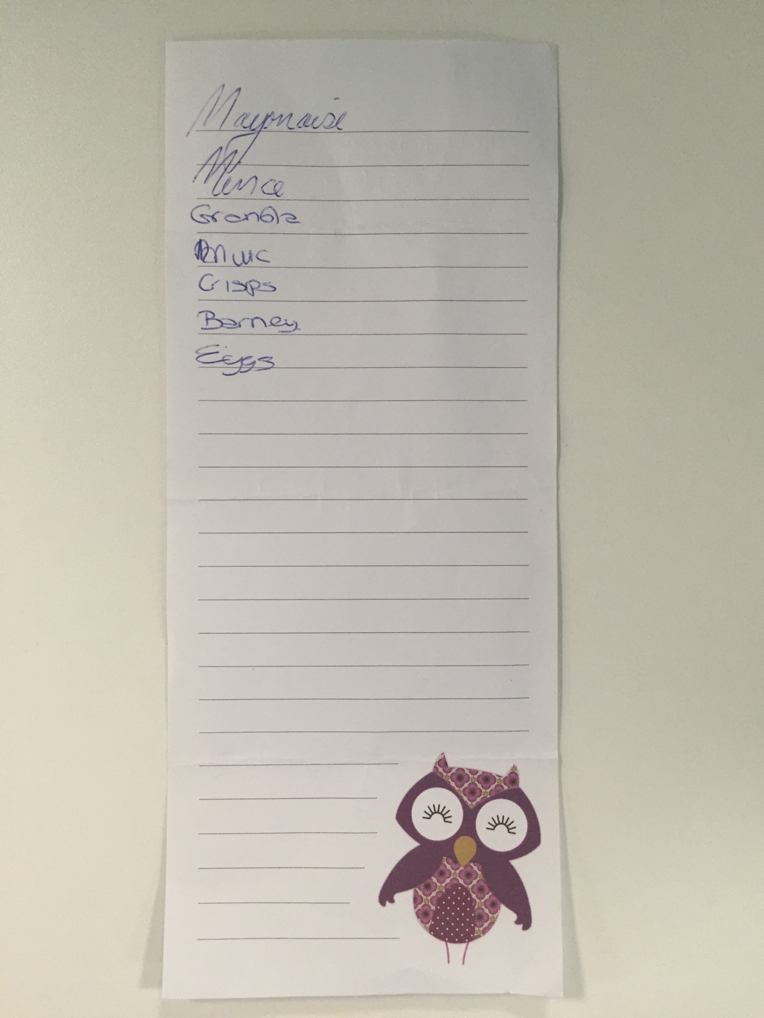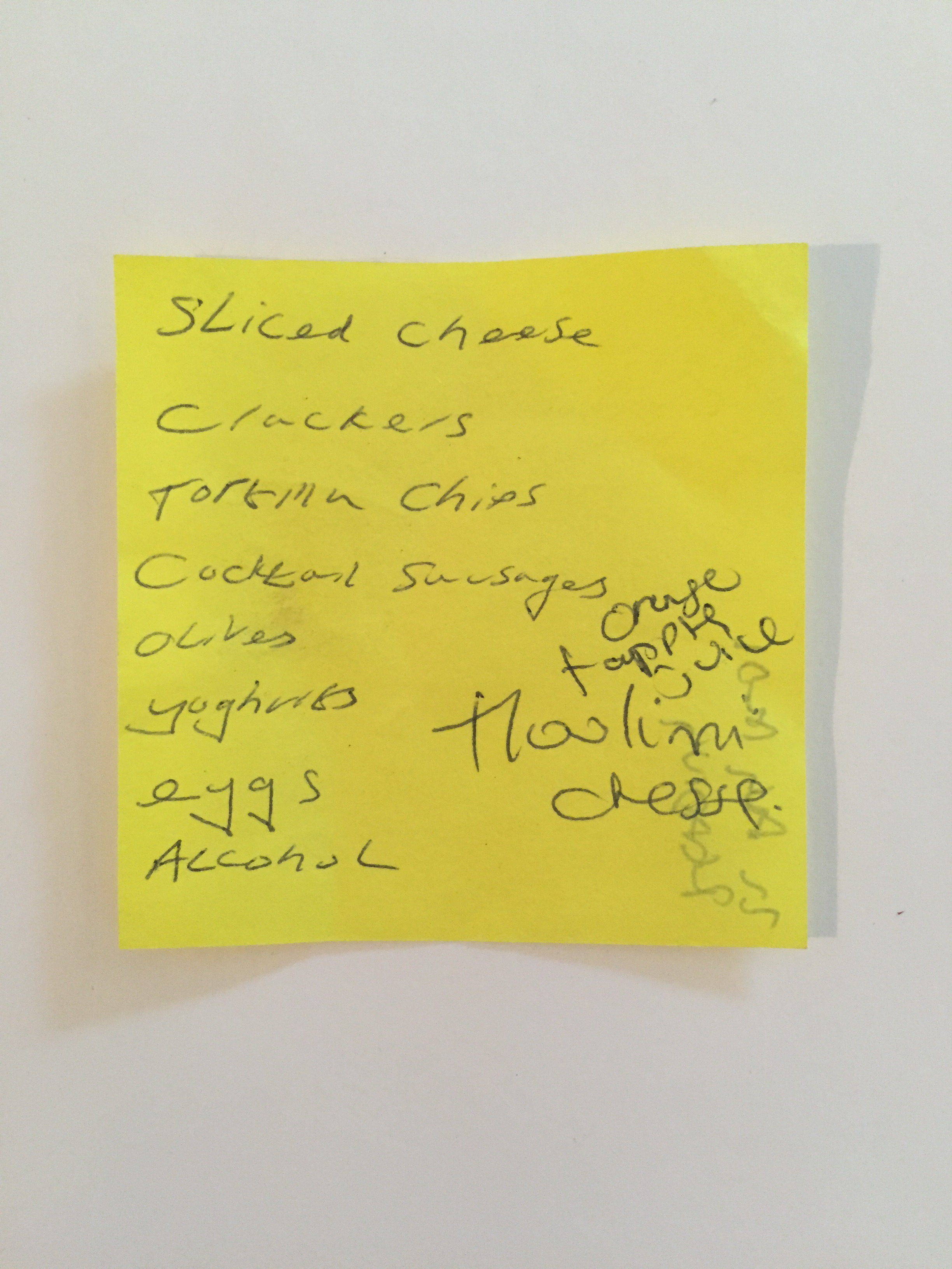 Em and Neil Dinner, sushi stuff, milk, pizza and bits for boys, washing up liquid, cereals, nuts, Miguel birthday present, popcorn, eggs, bacon, night cream.