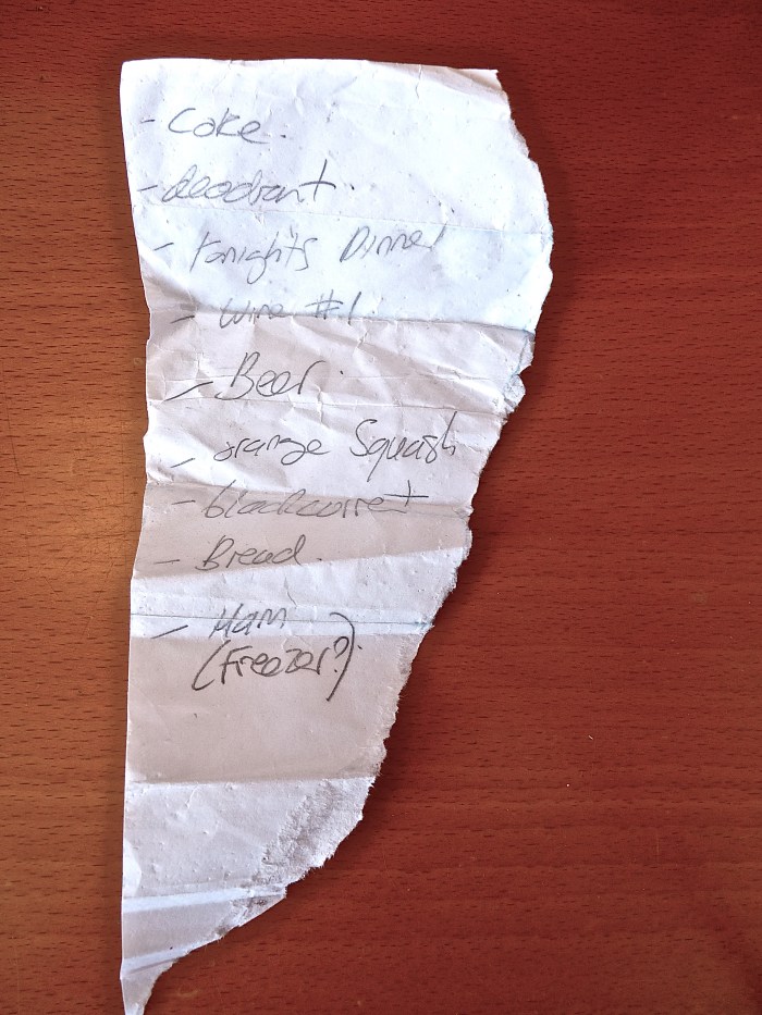 What else do we know? This list was taken from a spiral bound notepad which has been cut vertically. The list was written by more that one person, compare BLACK BAGS with Bananas, not only capitalisation but also a difference in the Bs.