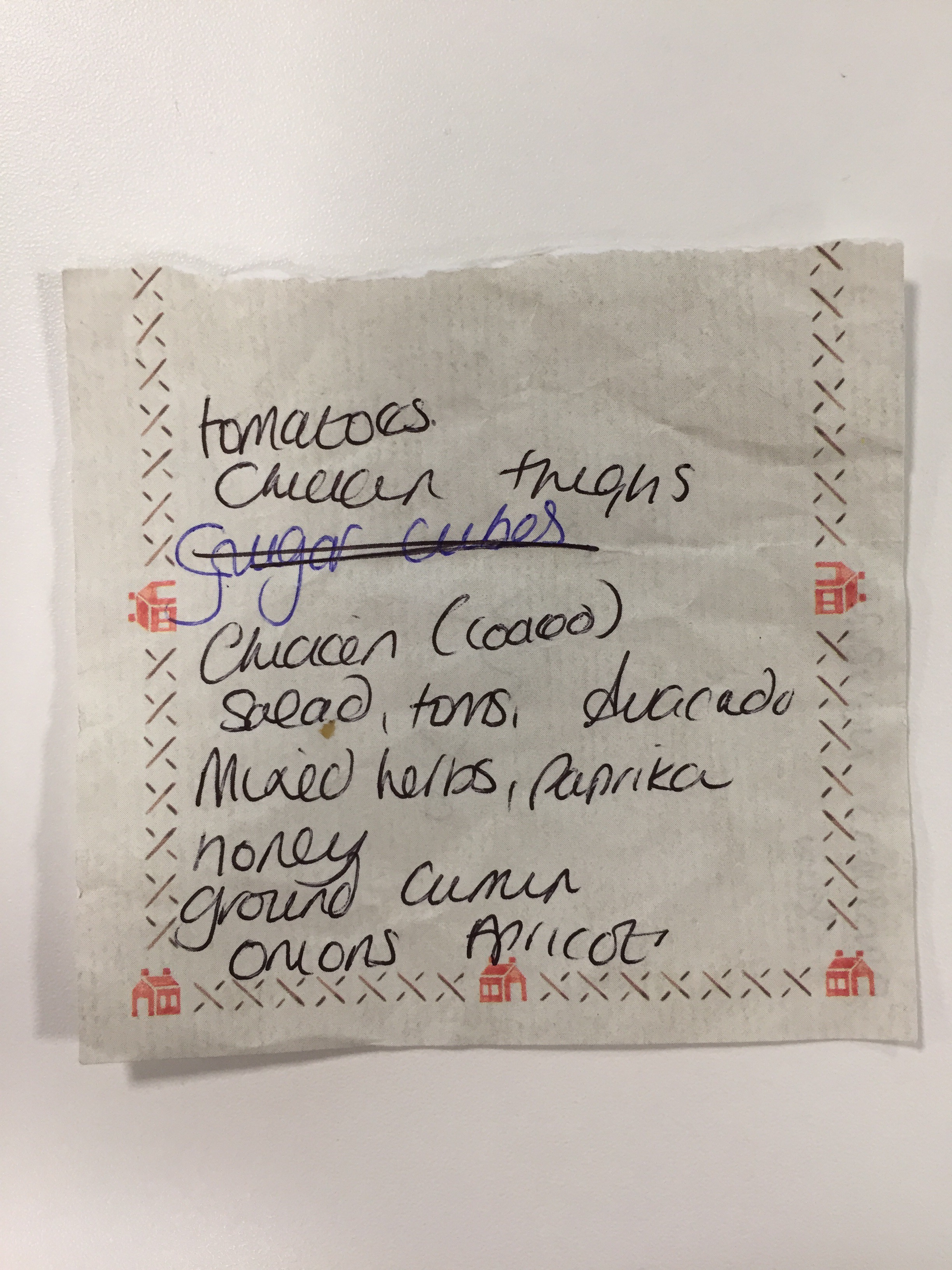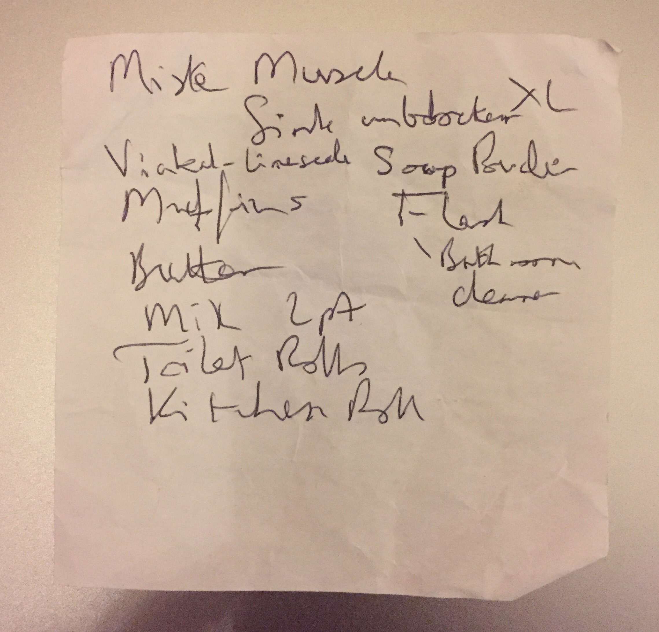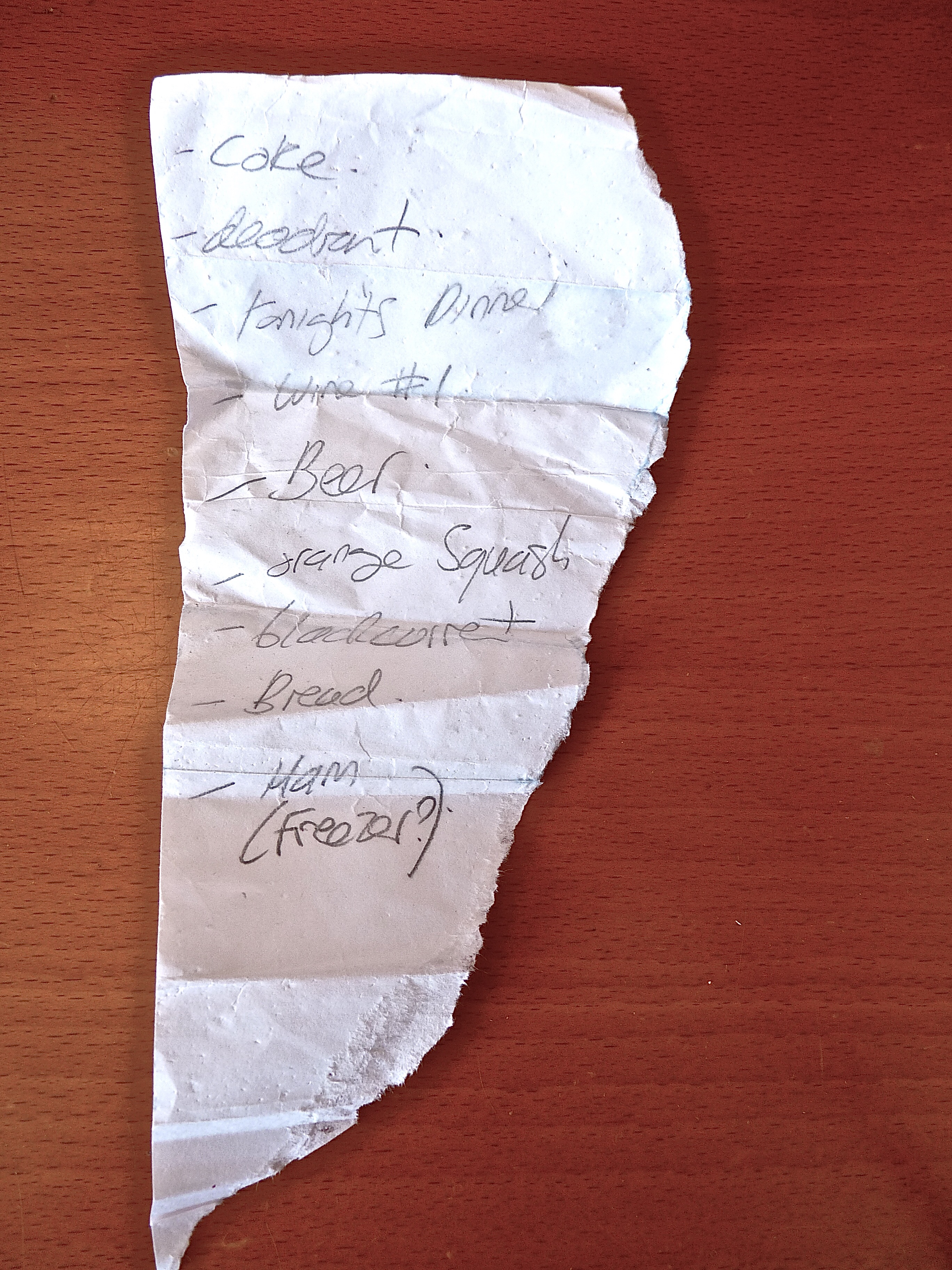 What else do we know? This list was taken from a spiral bound notepad which has been cut vertically. The list was written by more that one person, compare BLACK BAGS with Bananas, not only capitalisation but also a difference in the Bs.