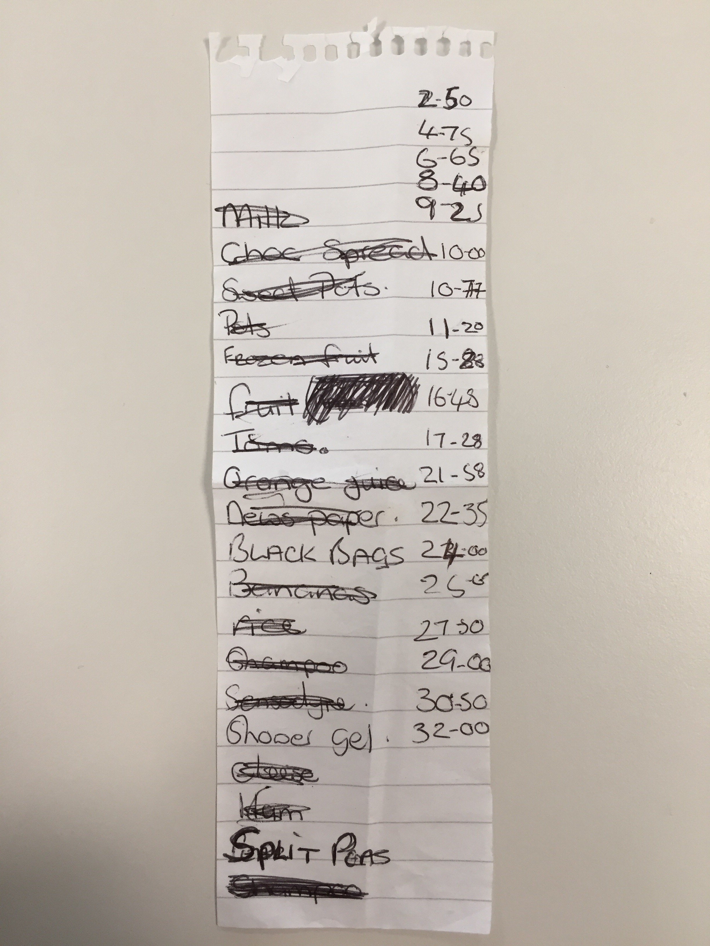 Milk, choc spread, sweet pots, pots, frozen fruit, fruit, toms, orange juice, newspaper, black bags, bananas, rice, shampoo, sensodyne, shower gel, cheese, ham, split peas, shampoo.