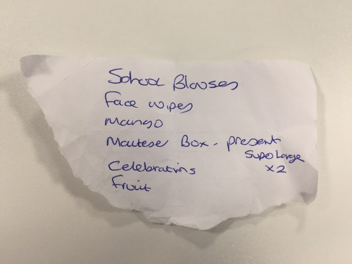 I would suggest that the owner of this list intended to visit one of the larger super markets which sells clothes, household goods and food. Alternatively this was a list for a visit to ‘town’ where multiple shops were to be visited. I don’t see many of those lists.