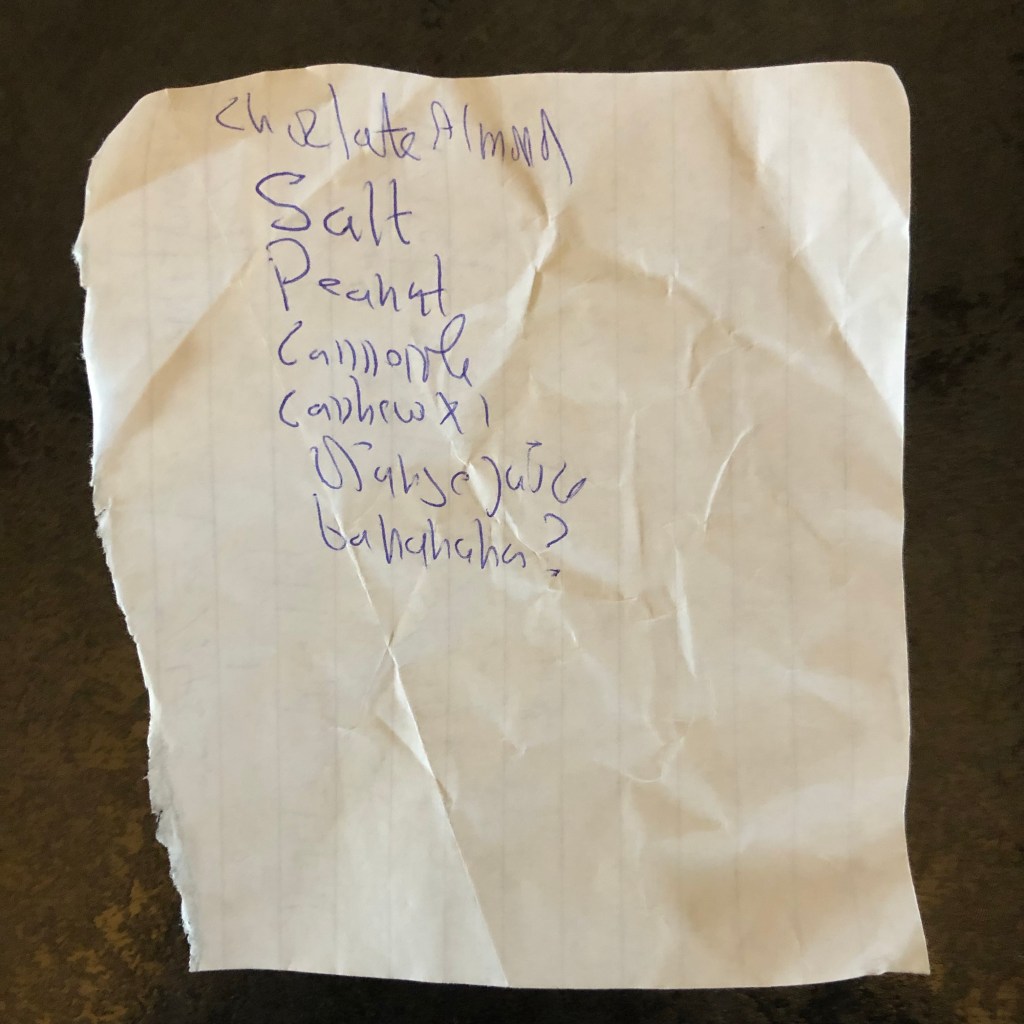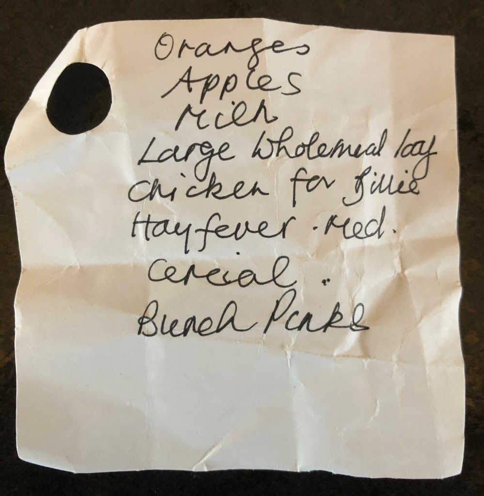 Found with its counterpart ‘custard pots’ at Morrisons in Bridport, U.K., this list is in the same hand, on the back of a betting slip but intertwined with a Waitrose receipt for items listed.