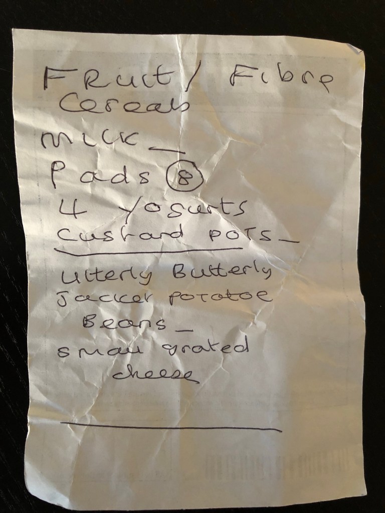 Some items are duplicated from the first list but also included are two tins of baked beans, Kellogg’s Fruit and Fibre and some ‘ready baked’ potatoes.
