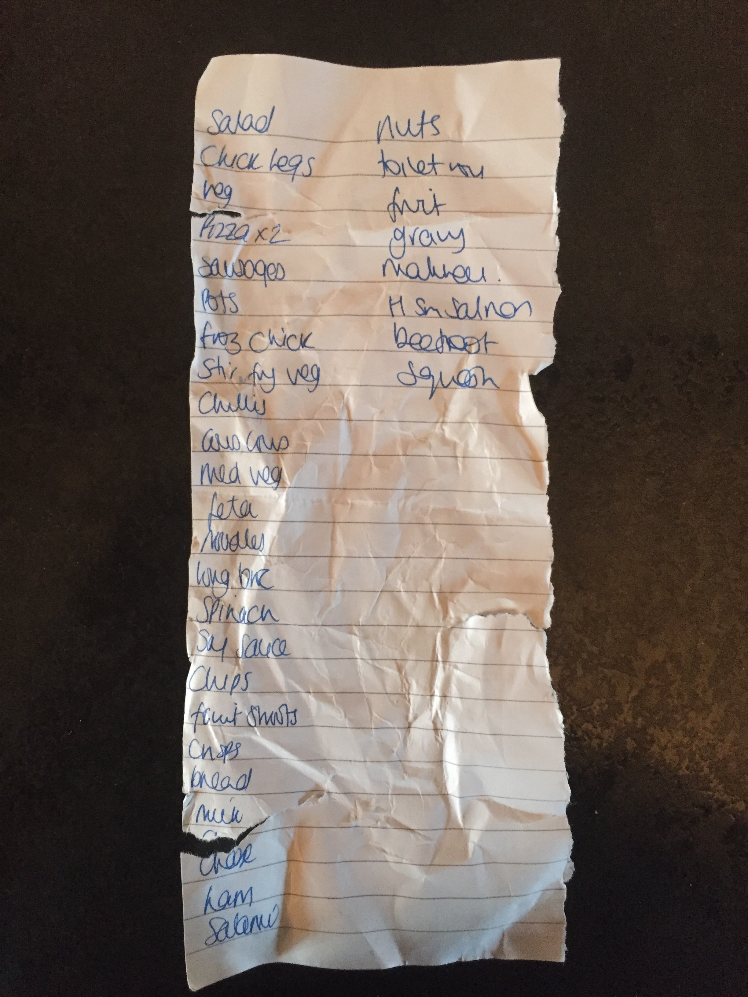 A torn piece of white paper hosts this shopping list written in pink pen. Notable items include bags that smell? Are these scented bin liners or some other smell related bags?