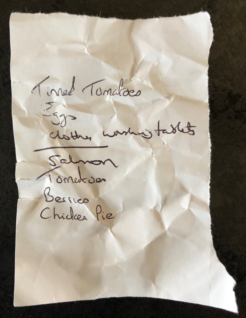All nicely written on purpose build shopping list note paper. Don’t see this very often.