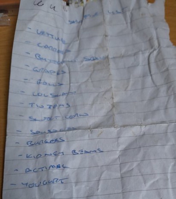 She says she found it whilst walking her dog – nowhere near a shop. The list has normal items with a good amount of fruit and veg. Burgers and rolls, lettuce, tinned tomatoes, yoghurt…