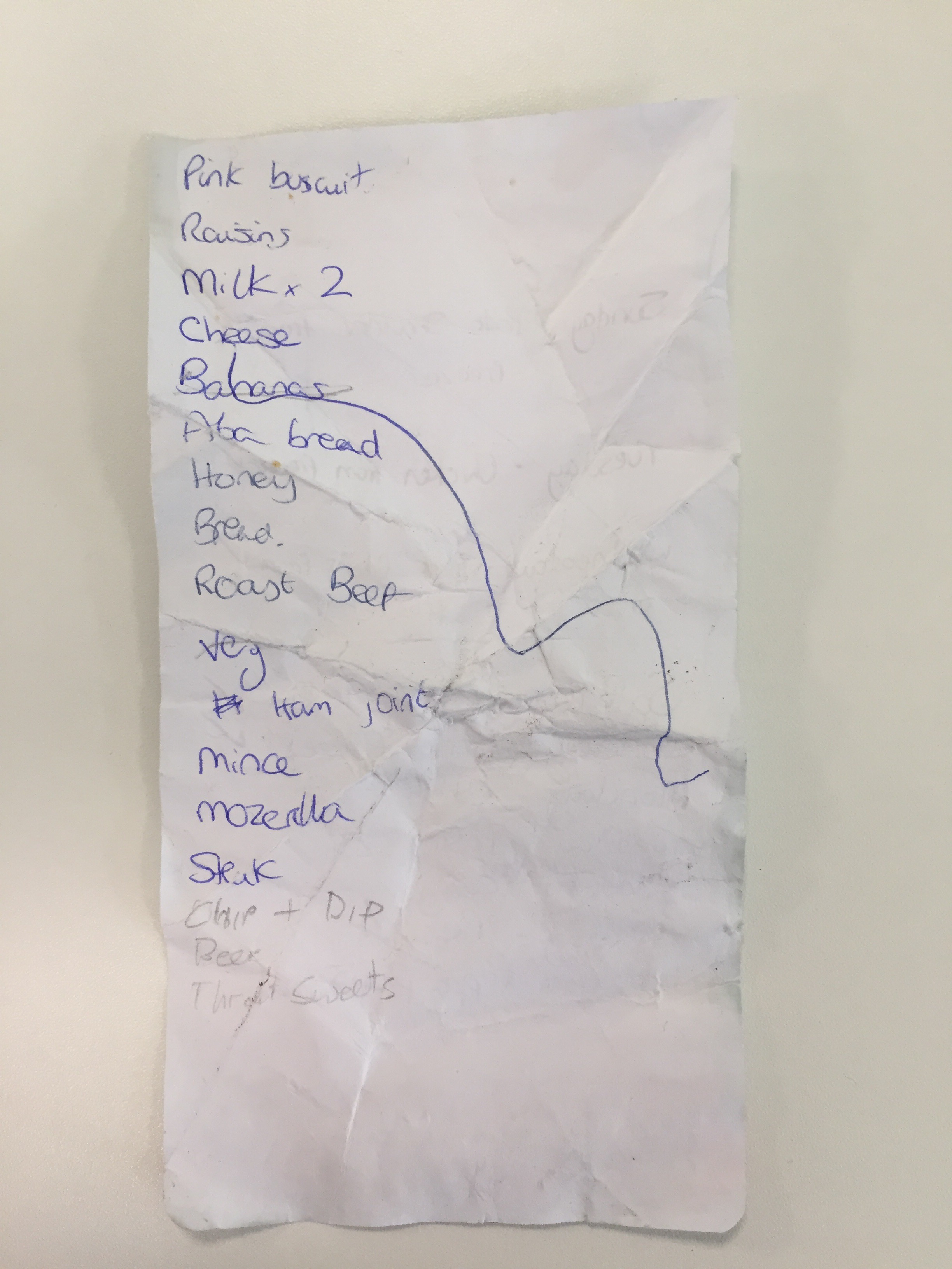 To aid reading whilst dashing through the supermarket, this happy shopper has organised their list into columns. All the staples are here for a large weekly shop.