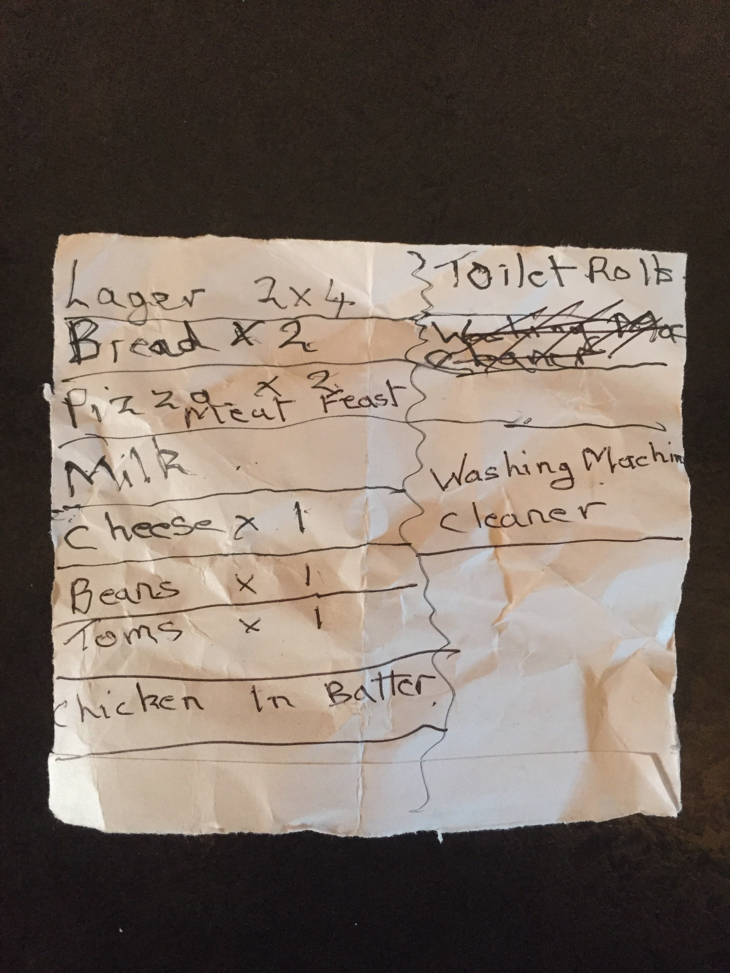 A back of an envelope shopping list. The hand writing in this one is confident but a bit tricky to understand. Fish swagi? Alop meat?