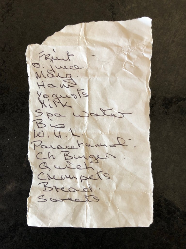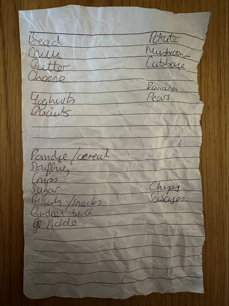 A5 Lined note paper with blue biro. Consistent use of the grocer’s apostrophe.
