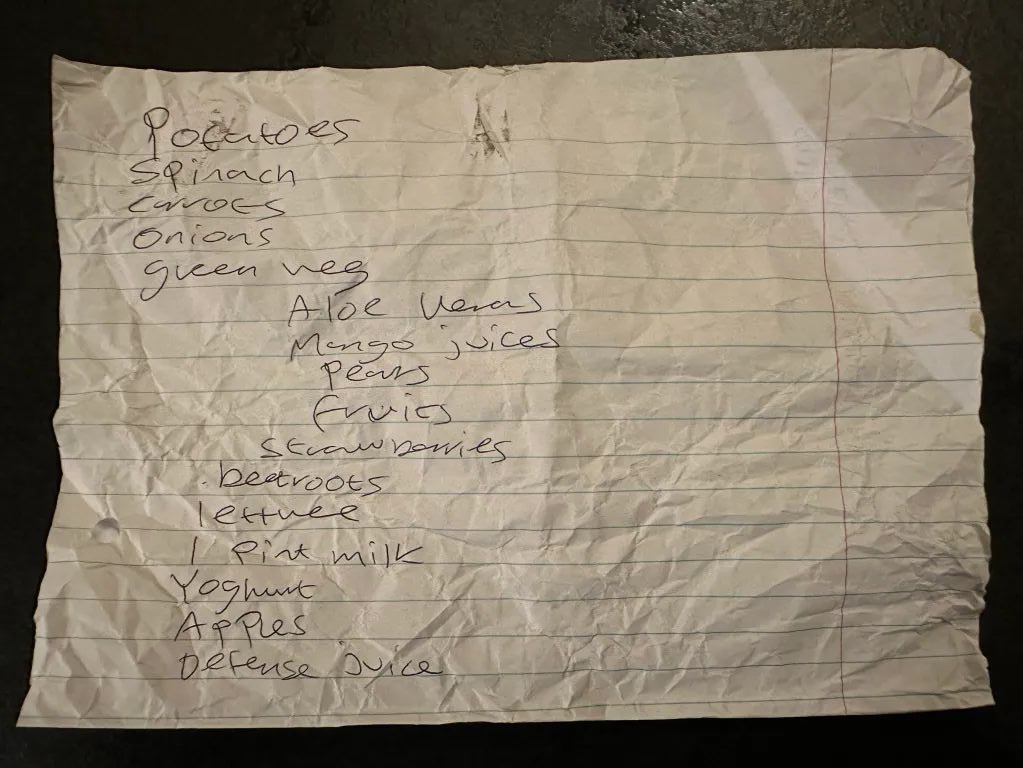 Wet wipes, mushy peas, vinegar, Nando’s sauce, Pepsi Max, Branston Pickle, Coffee, sugar, crunchy nut cornflakes, lettuce, carrots, margarine, cucumber, soft cheese, bungee glue gum, mayonnaise, tomato sauce, alda, fish food, 3 or 4 chicken joints.