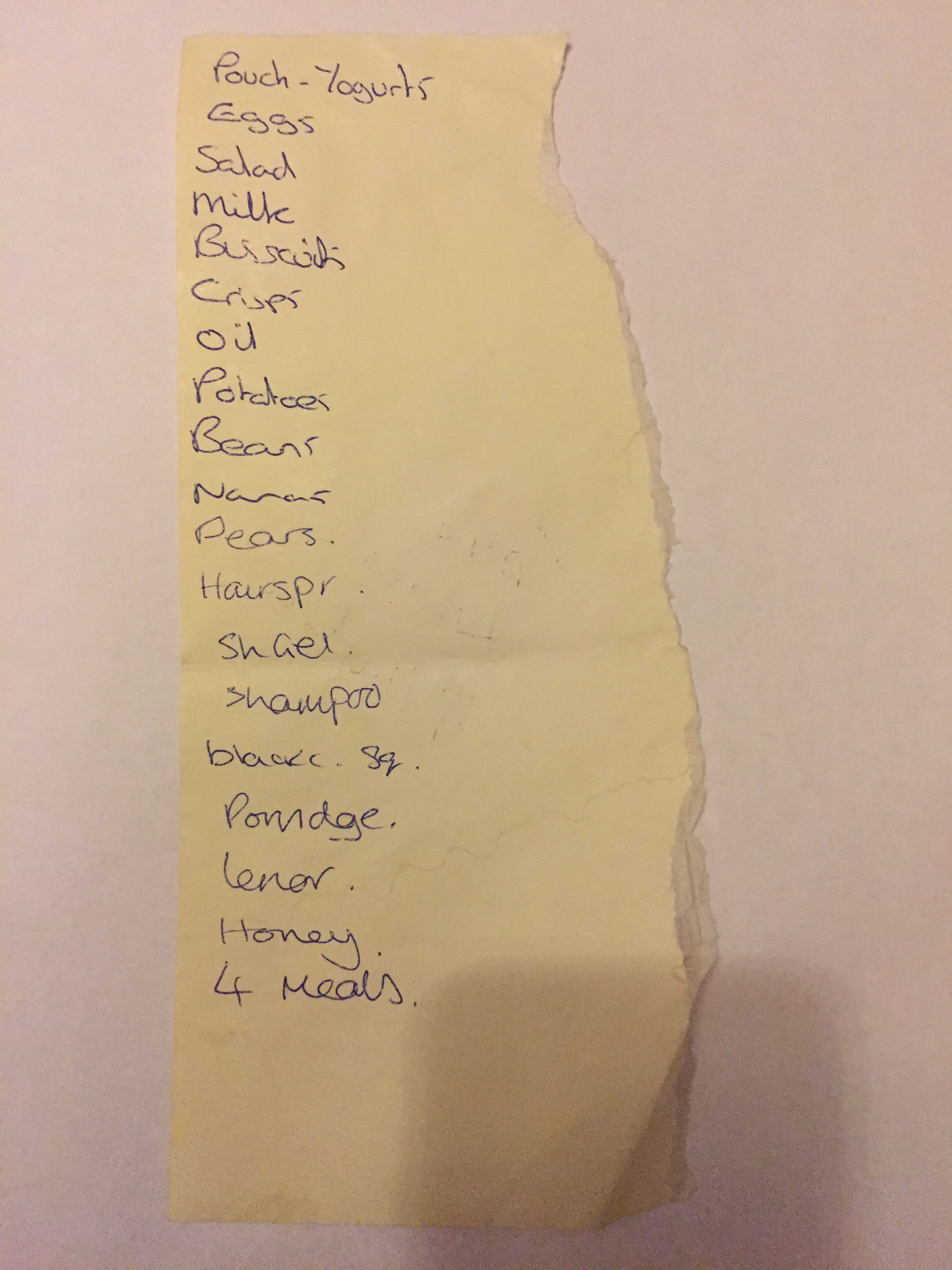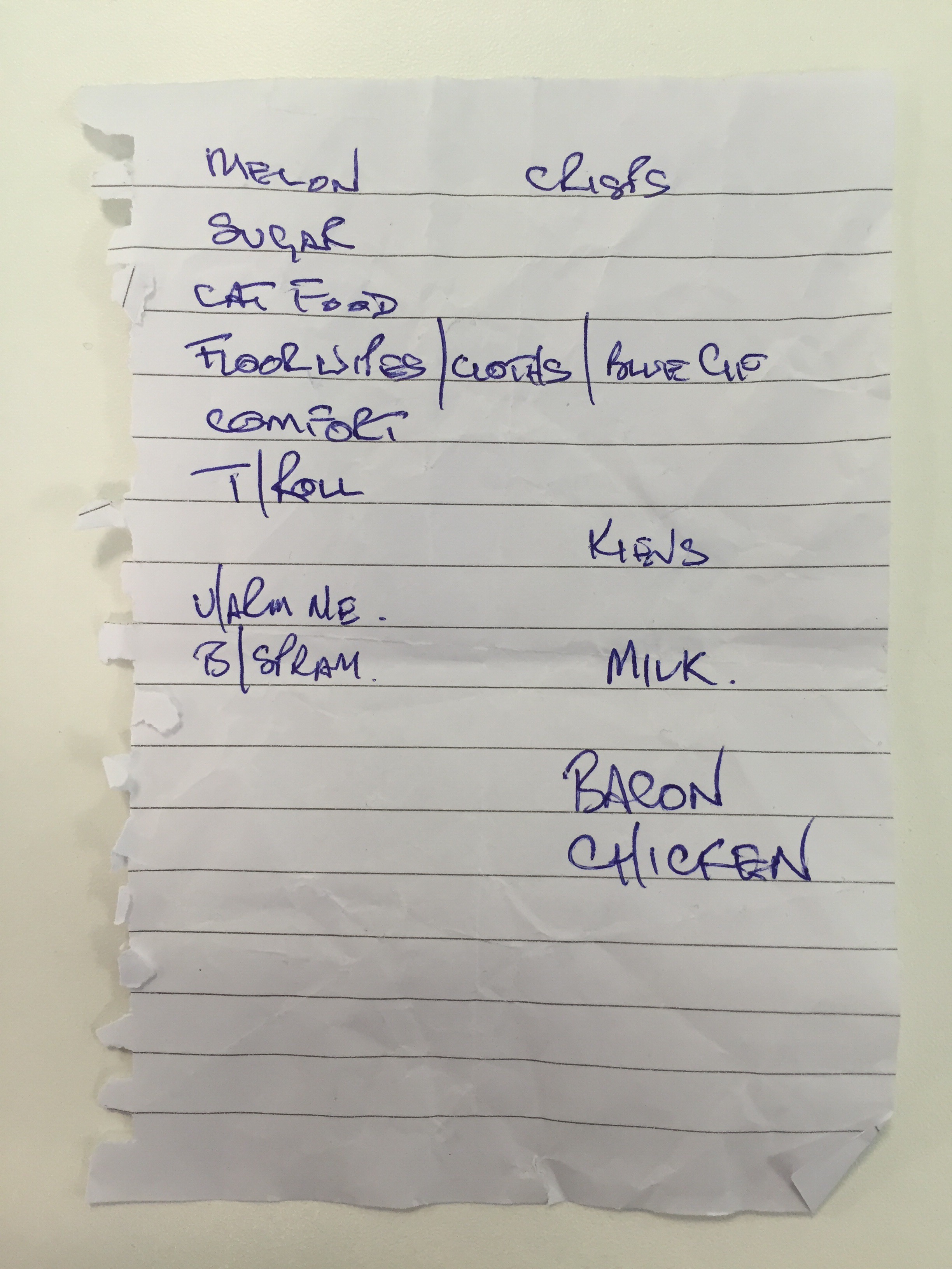 Firstly, pink pen and beautiful cursive script is not a common occurrence in the world of shopping lists. A colourful and welcome addition.