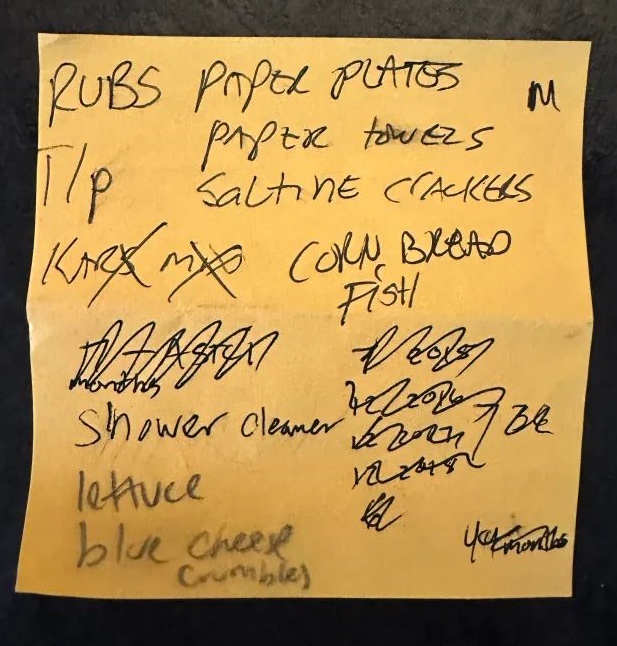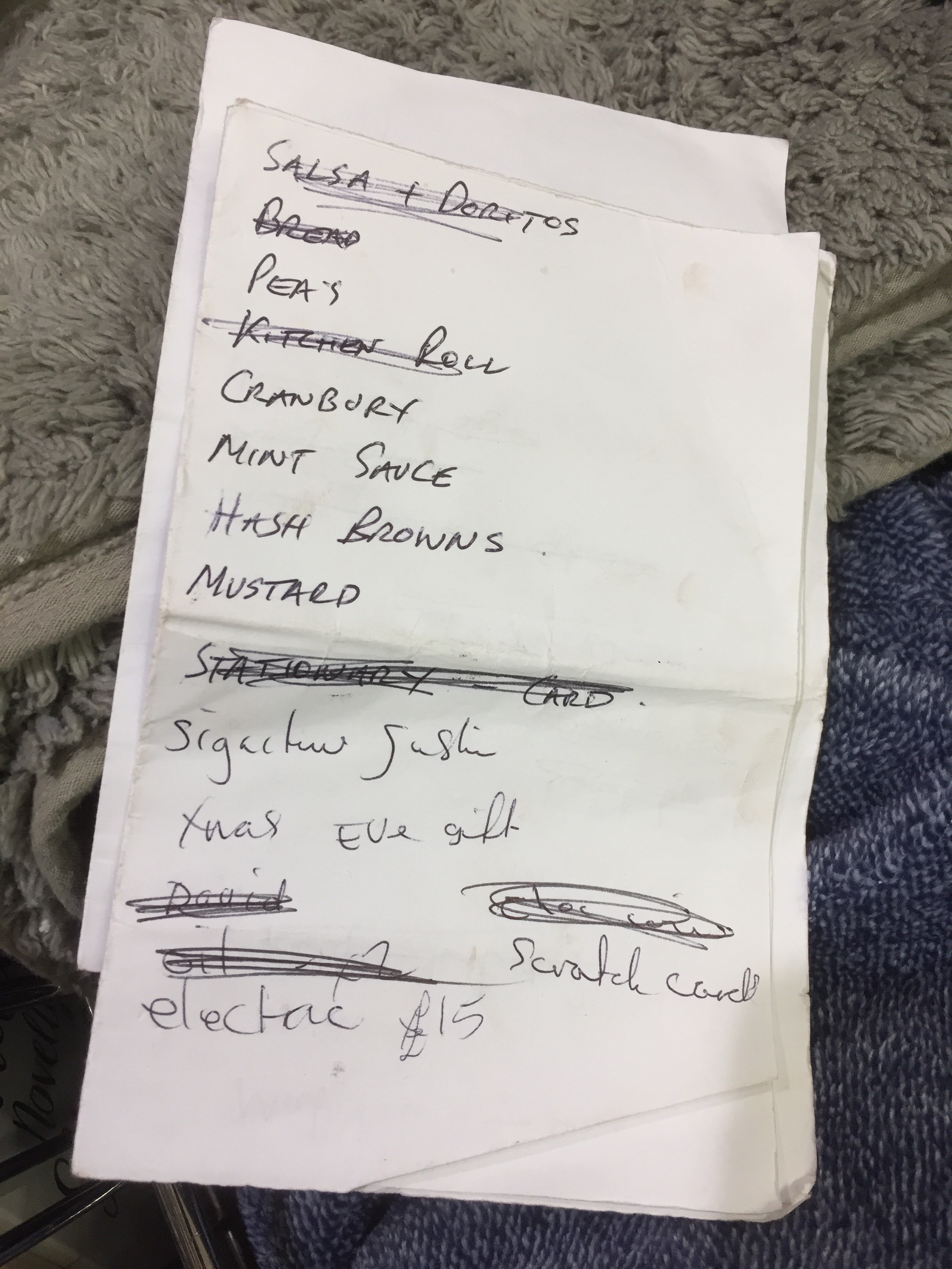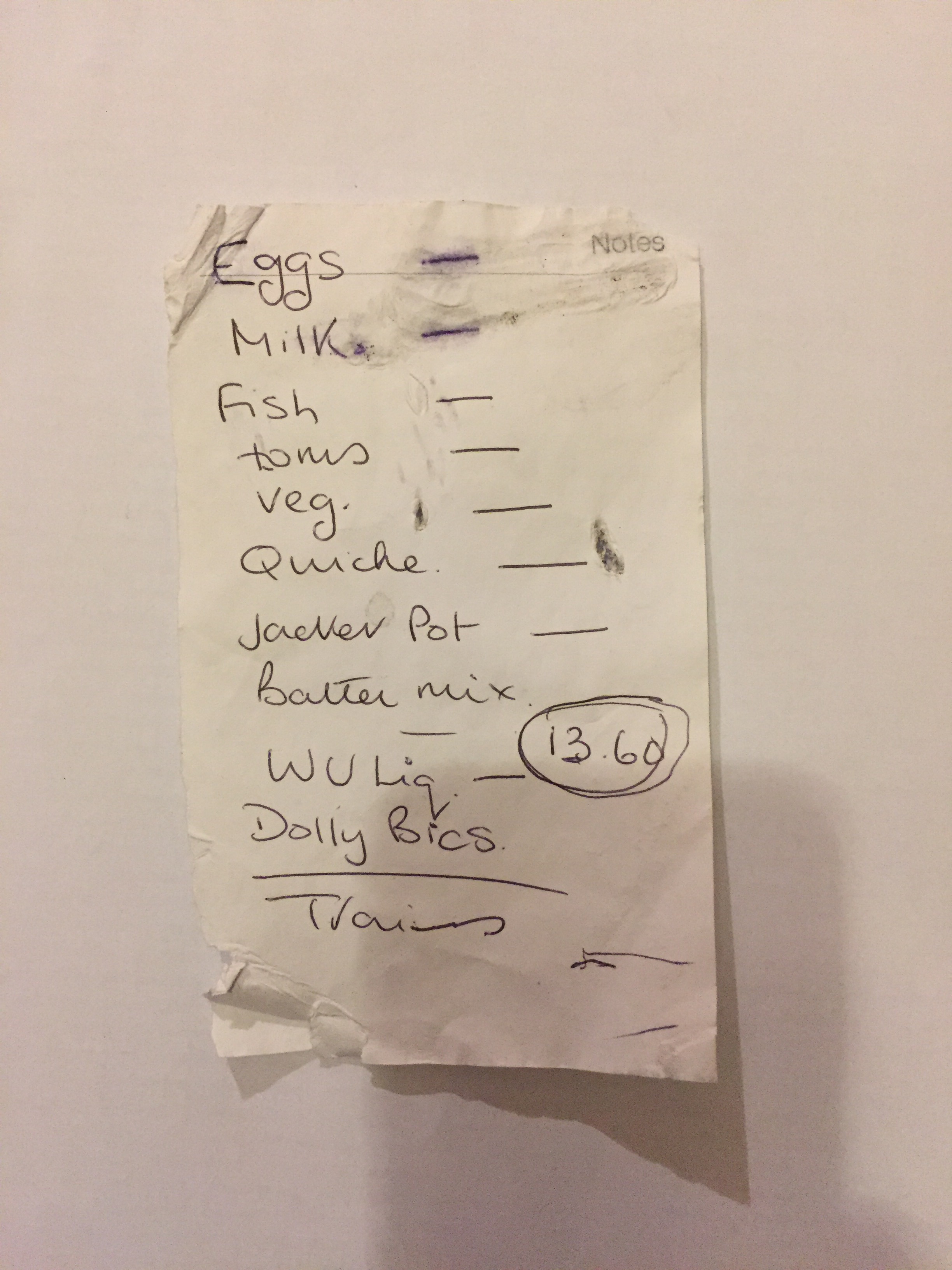 Found in Waitrose, UK, this shopping list is bulleted with little circles prefixing each item. Blue pen on a back of an envelope.