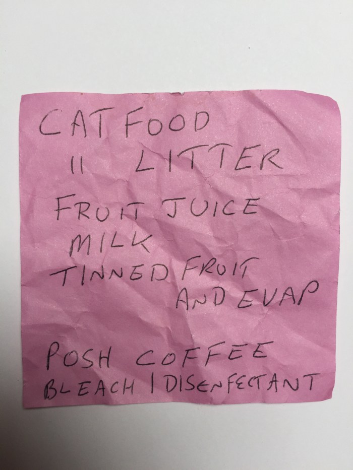 Cat food, cat litter, fruit juice, milk, tinned fruit and evap, posh coffee, bleach, disinfectant.