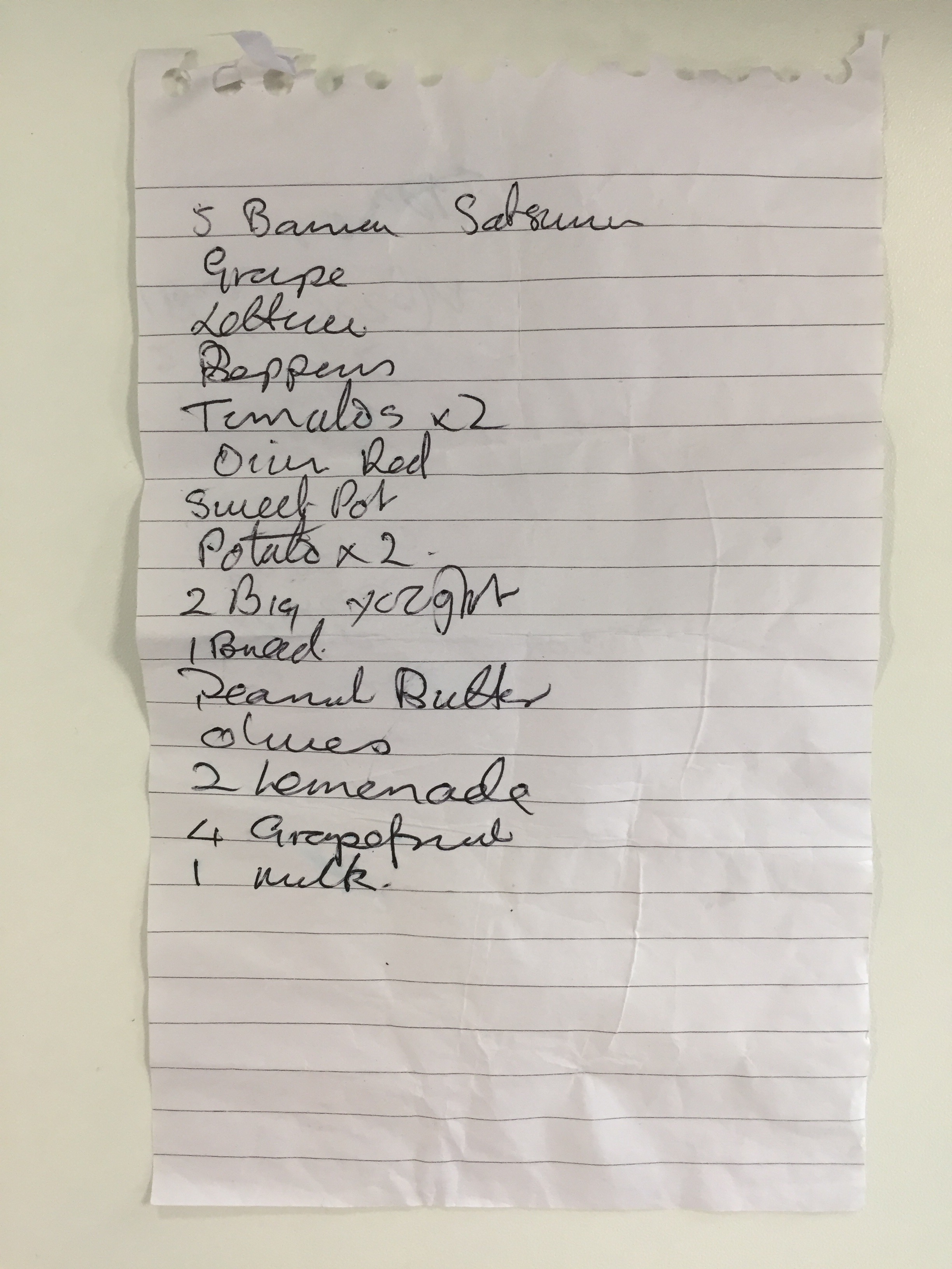 Found in Waitrose, UK, this shopping list is bulleted with little circles prefixing each item. Blue pen on a back of an envelope.