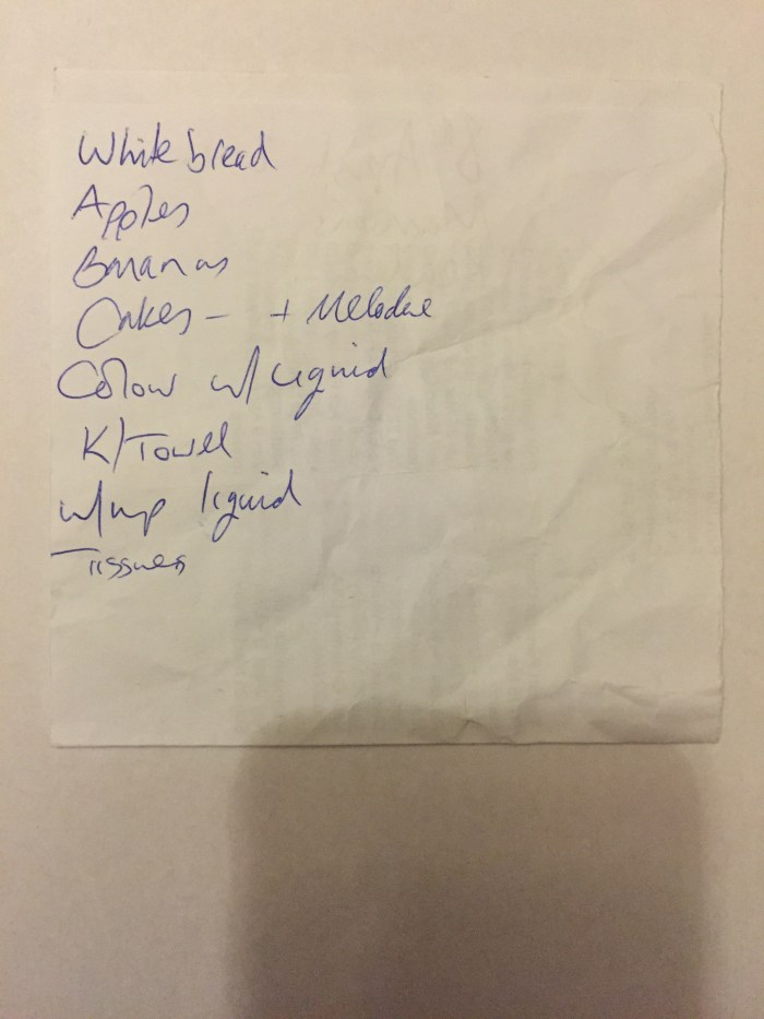 White bread, apples, bananas, cakes – melodas?, colour washing liquid, kitchen towel, washing up liquid, tissues.