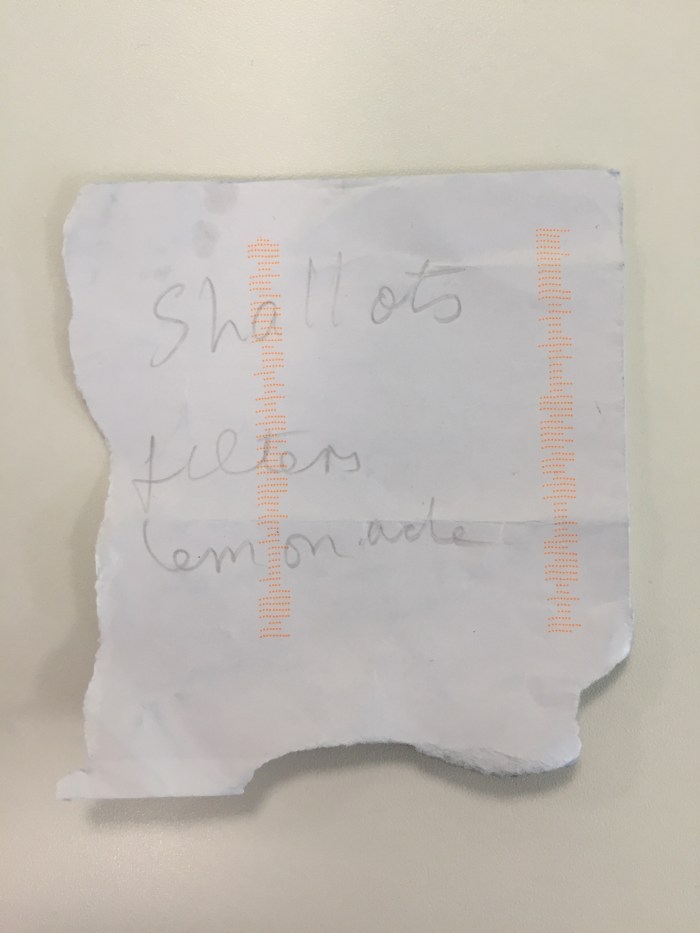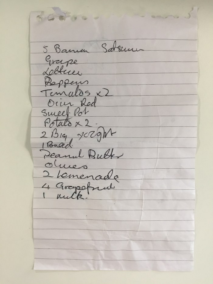 Donated by a generous benefactor, this list has 11 items excluding mysterious line 8 which has been crossed out. I believe it may say ‘ice cre’ but I may be mistaken.