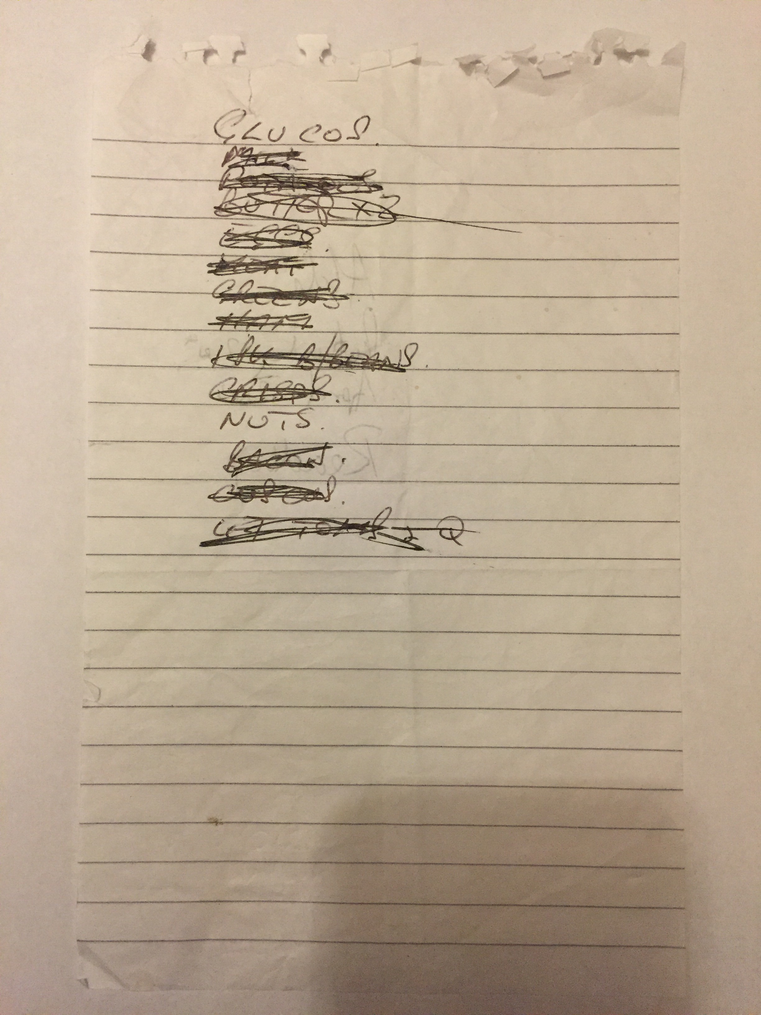 Fruit, bread | rolls | bagels, Dolmio sauce x 2, Lasagne sauce and sheets, Appals x 100,000, chicken pieces, chicken breast and thigh, mince x 3, sausages x 2, bananas x 54, cod pieces, kids bits, cat biscuits, scampy fries x 2, cheese, homs?/meats, coconut milk, grated cheese, mozzarella, halloumi, sour cream, taco shells, mange tout, baby something, cucumber, chillis, tomatoes, salad, avocados, olives, coriander, onions, mushrooms, peppers and “by a chinees takeaway for cata” [sic].