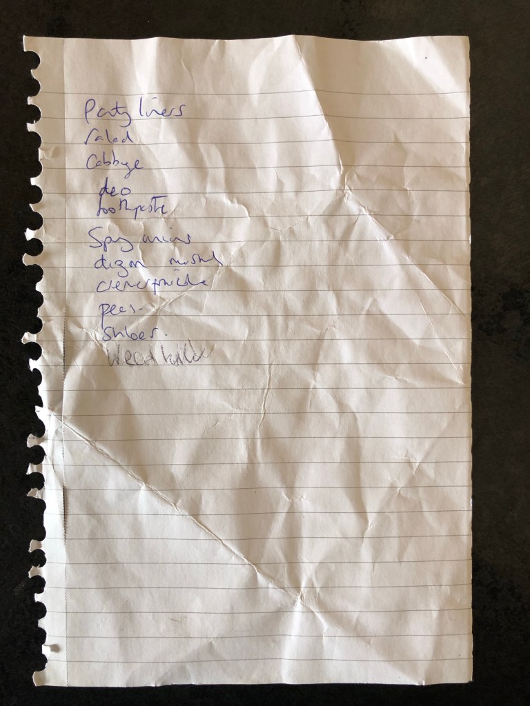 A5 spiral bound shopping list, lined, blue biro. Later addition of weedkiller in a black pen. A pen that was reluctant to work.