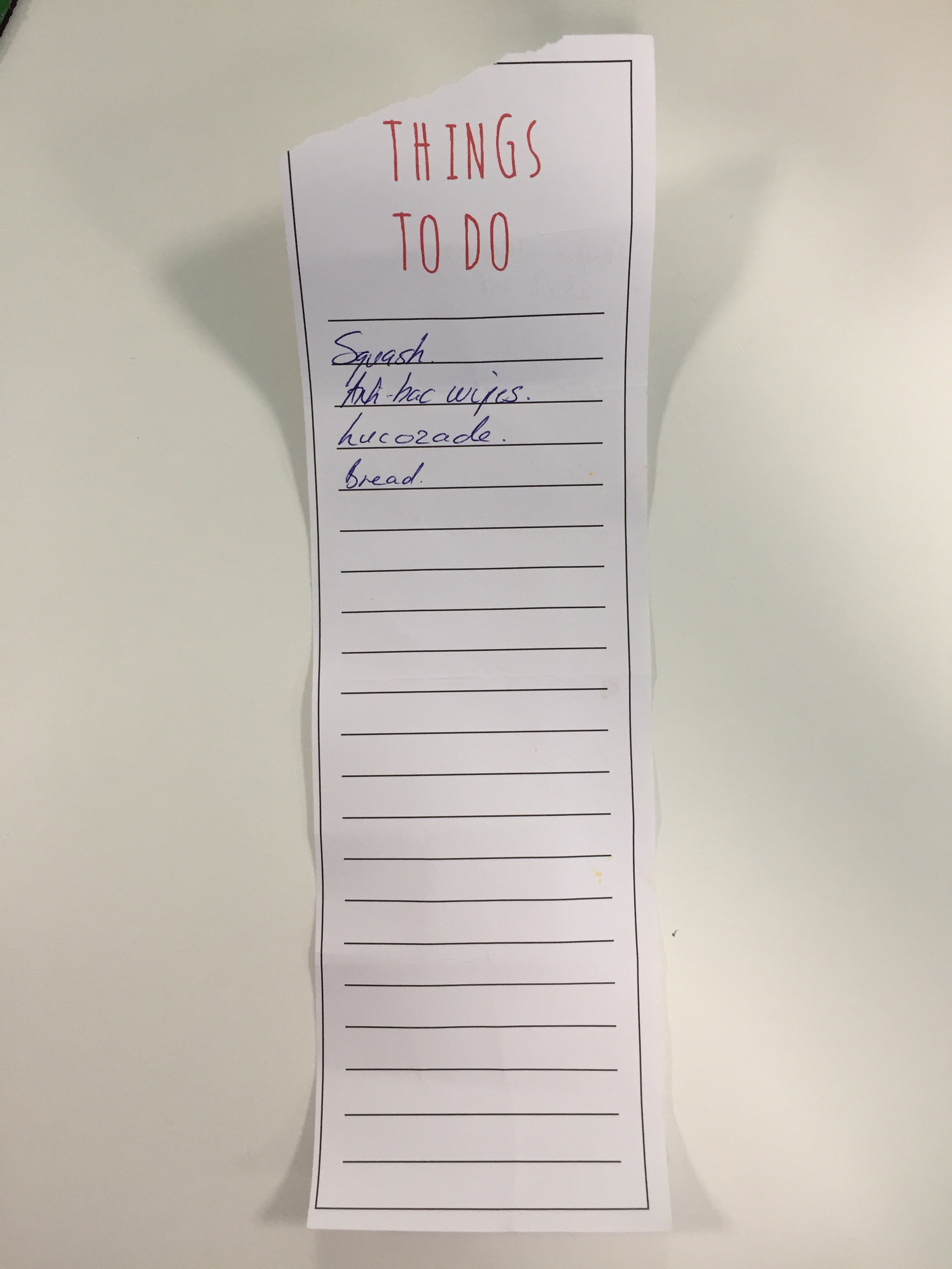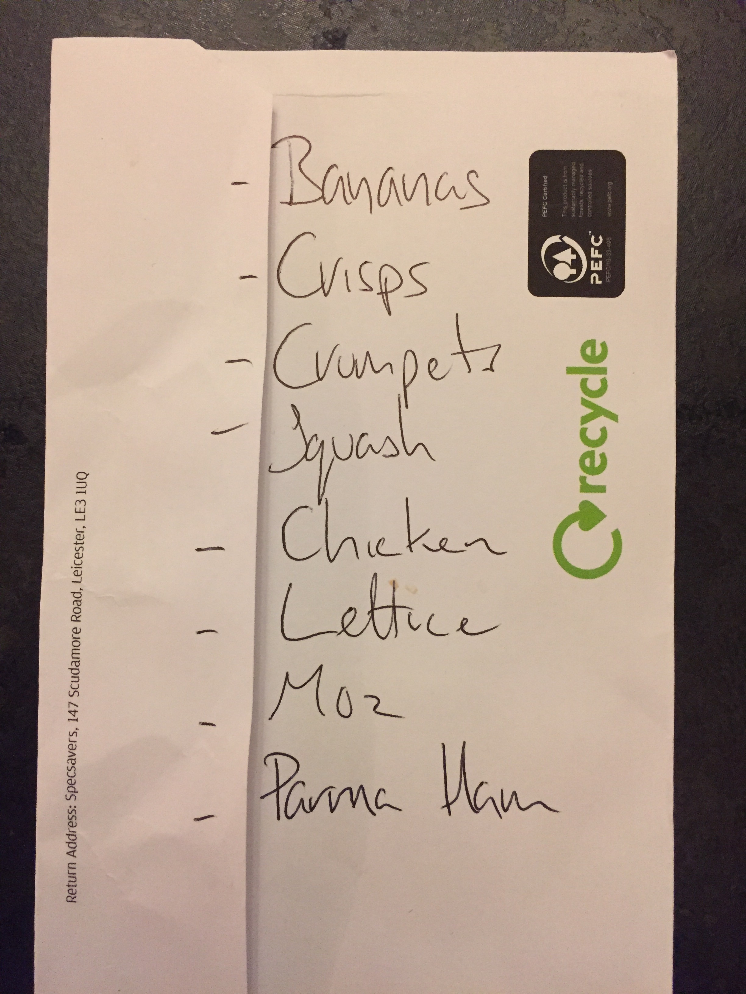 This shopping list owner likes detail, 2 bananas precisely, “Kellogg’s”cereal rather than just cereal, “Ryvita Rye Crispbreads” when Ryvita would have sufficed.  In fact I think this list was written for somebody else to do the shopping, the numbers and brands are instructions.