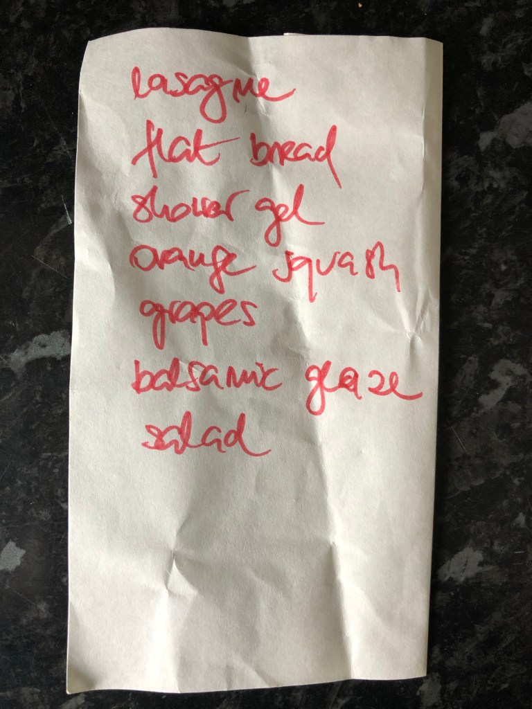Coke, deodorant, tonight’s dinner, wine #1, beer, orange squash, blackcurrent, bread, ham (freezer?).