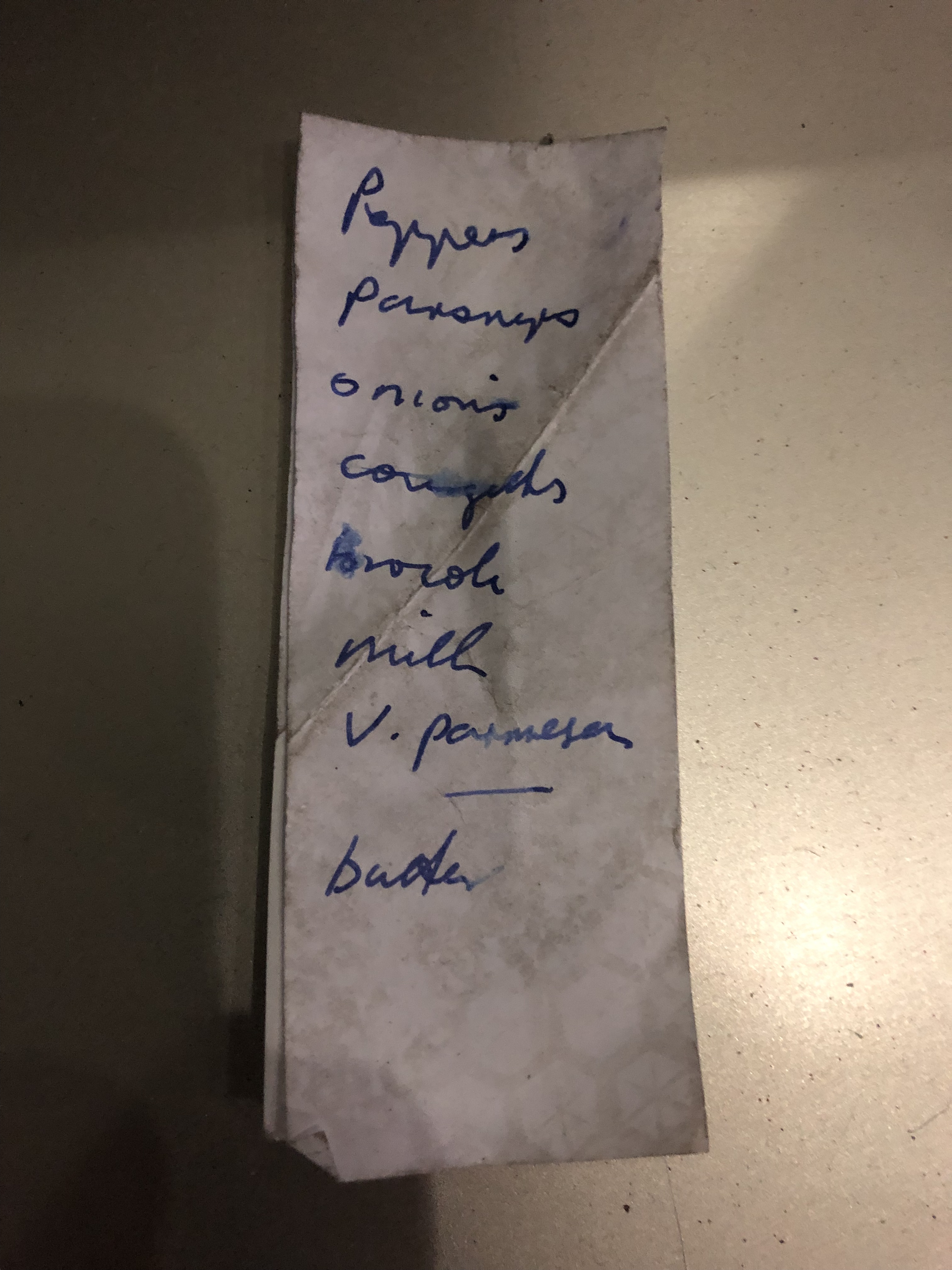 In just about every archive, no two shopping lists have the same list of contents. There are favourite items of course; bread, milk, eggs, butter… but very quickly people’s individual requirements come to the fore; sauce pan, birthday card, Breathright, mouse treats…